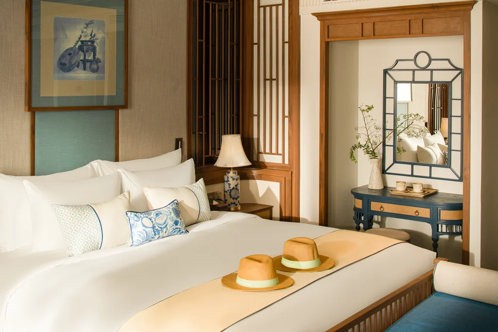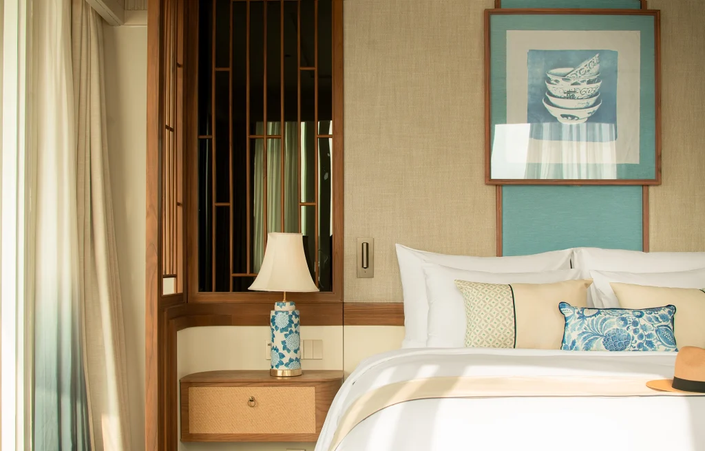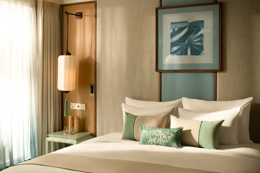 Inspired by the lush beauty beauty of tropical forests, each cabin features hand-drawn watercolor textile designs: calm yet vibrant and vivacious.