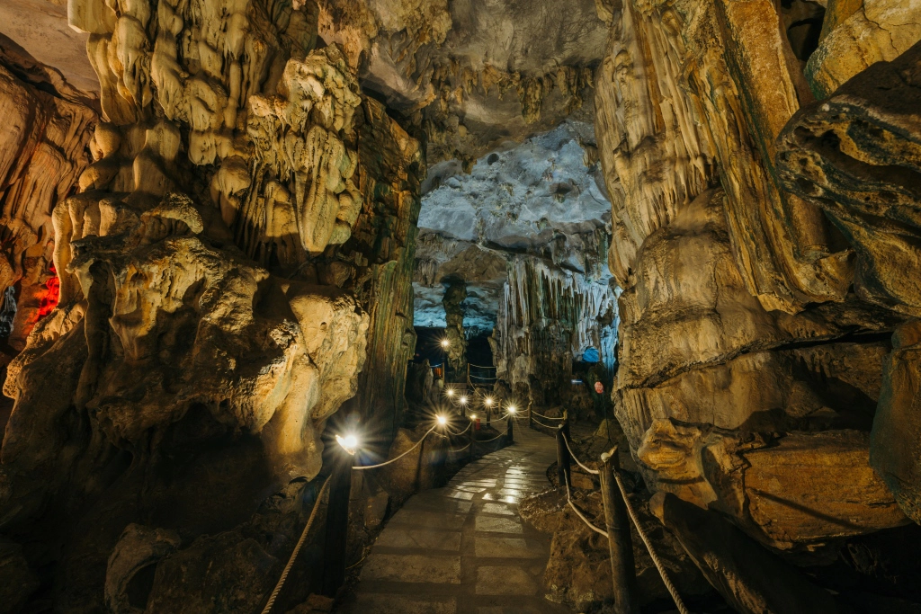 Tien Ong Cave, situated 5 meters above sea level, is one of Ha Long Bay’s lesser-known and quieter treasures. Nestled amidst the pristine landscapes of Cai Tai Island, it features an array of timeless stalactites and stalagmites, offering a glimpse into the bay’s natural wonders.